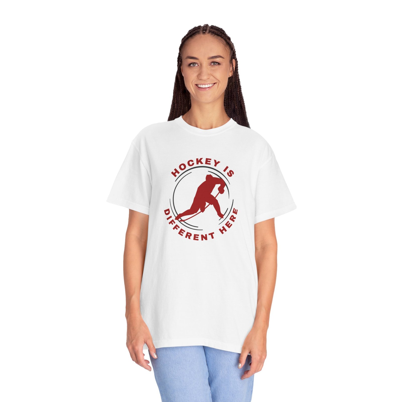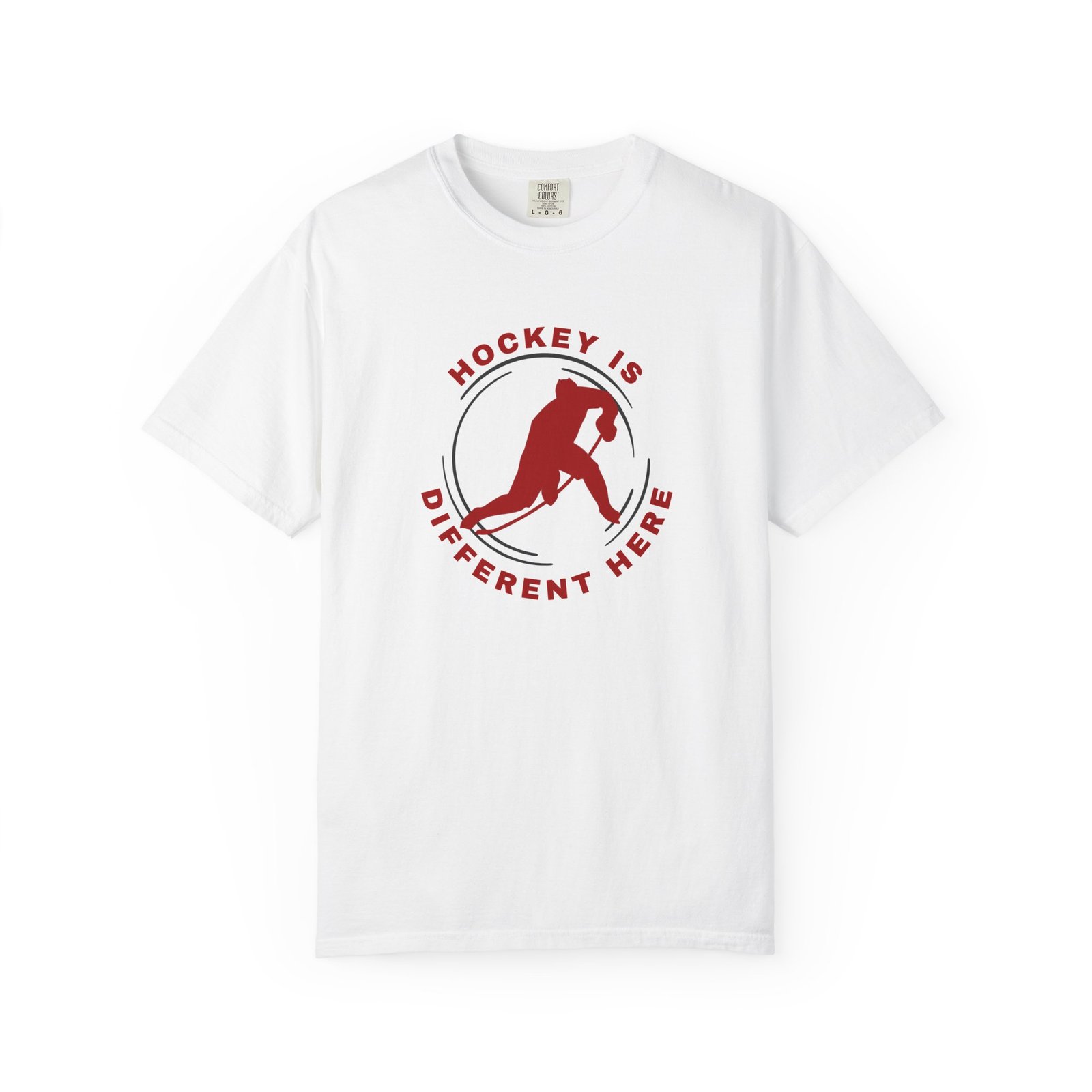 This heavyweight, garment-dyed tee is built for those who live inside that world. The bold red hockey silhouette cuts clean against a deep black base, delivering a look that’s direct, unapologetic, and rooted in the grind. No flash. No fluff. Just hockey.